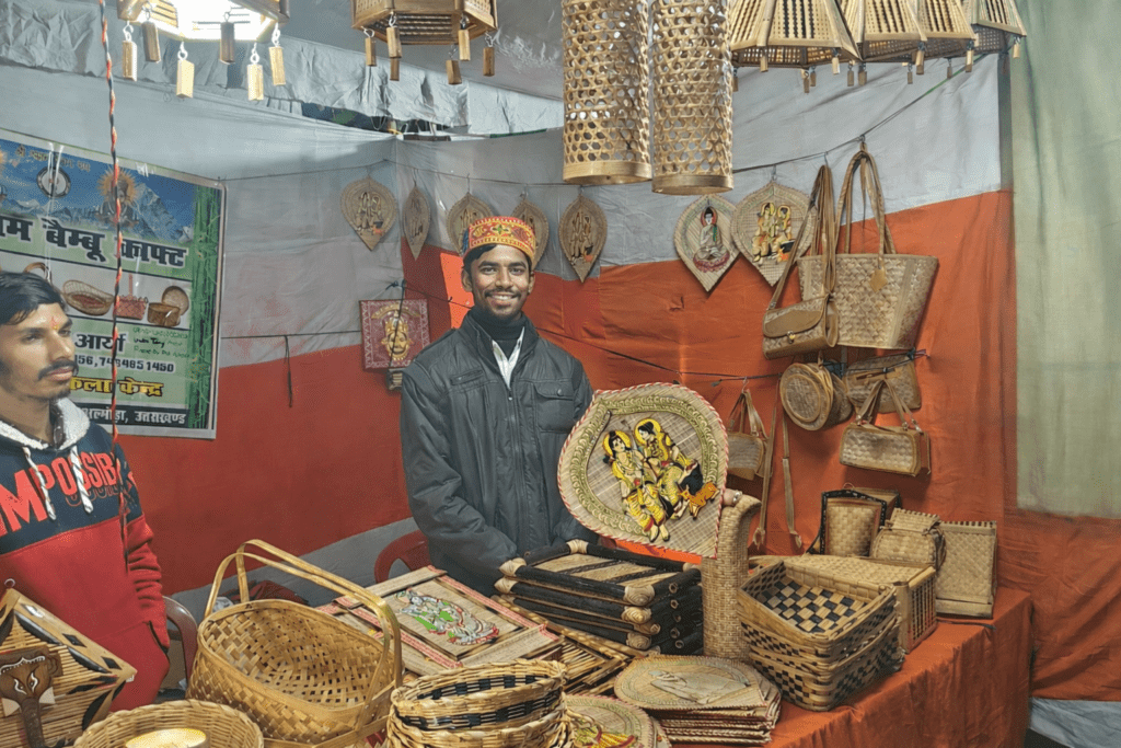 अल्मोड़ा से आए कारीगरों द्वारा तैयार बांस से बनी पेंटिंग, टोकरियां, लैंप, बैग और वॉल हैंगिंग को लोग खूब पसंद कर रहे हैं। सभी उत्पाद हाथ से बनाए गए हैं।