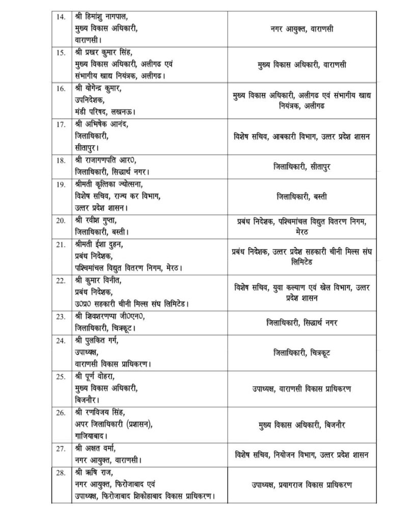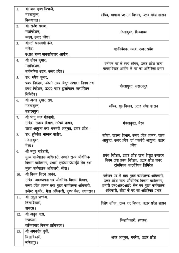 इस प्रशासनिक फेरबदल में 10 जिलों के डीएम और 3 मंडलायुक्त शामिल हैं।विंध्याचल, सहारनपुर और मेरठ के कमिश्नरों के साथ-साथ सीतापुर, बलरामपुर, कौशांबी और श्रावस्ती के डीएम बदले गए हैं।