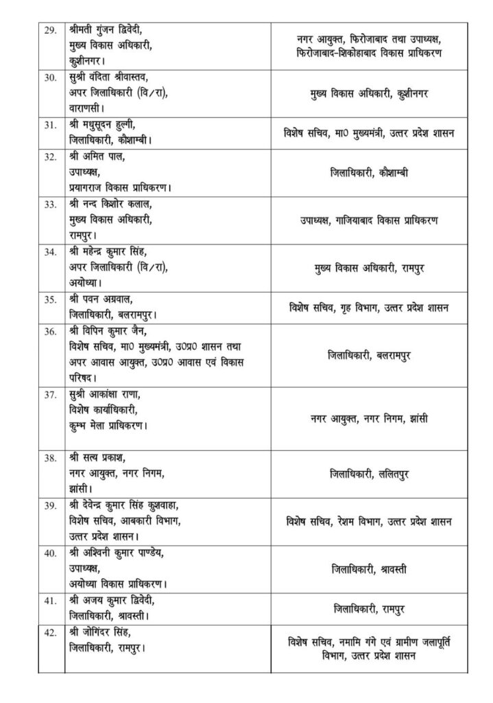 वाराणसी की एडीएम वंदिता श्रीवास्तव को कुशीनगर का सीडीओ नियुक्त किया गया है। वहीं, रामपुर के सीडीओ नंद किशोर कलाल को गाजियाबाद विकास प्राधिकरण का उपाध्यक्ष बनाया गया है। मिर्जापुर के आईएएस बाल कृष्ण त्रिपाठी को सचिवालय सामान्य प्रशासन विभाग में भेजा गया है, उनकी जगह राजेश कुमार को नया मंडलायुक्त मिर्जापुर नियुक्त किया गया है।